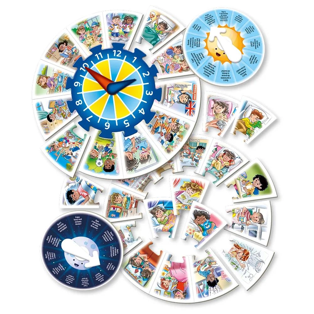 Contém: 1 Relógio cartonado, 30 peças ilustradas, 2 roletas e 2 setas.