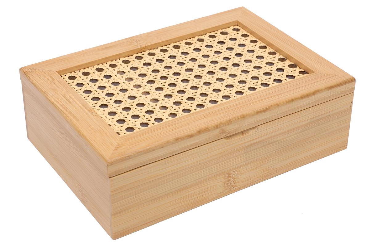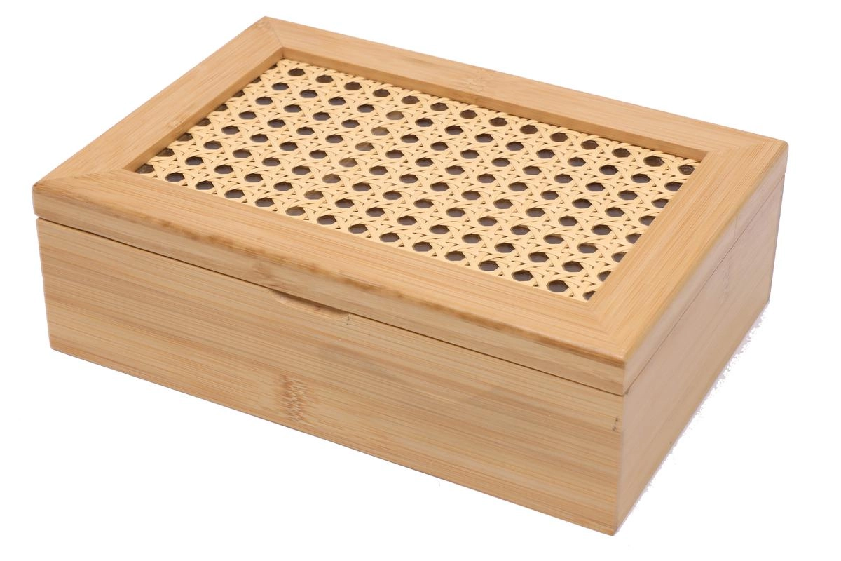 A caixa é produzida em bambu, material resistente e higiênico, pois não pega e nem transfere gostos e odores aos alimentos. Além disso, possui a tampa trabalhada em acrílico e palha que confere a caixa maior transparência e estilo.