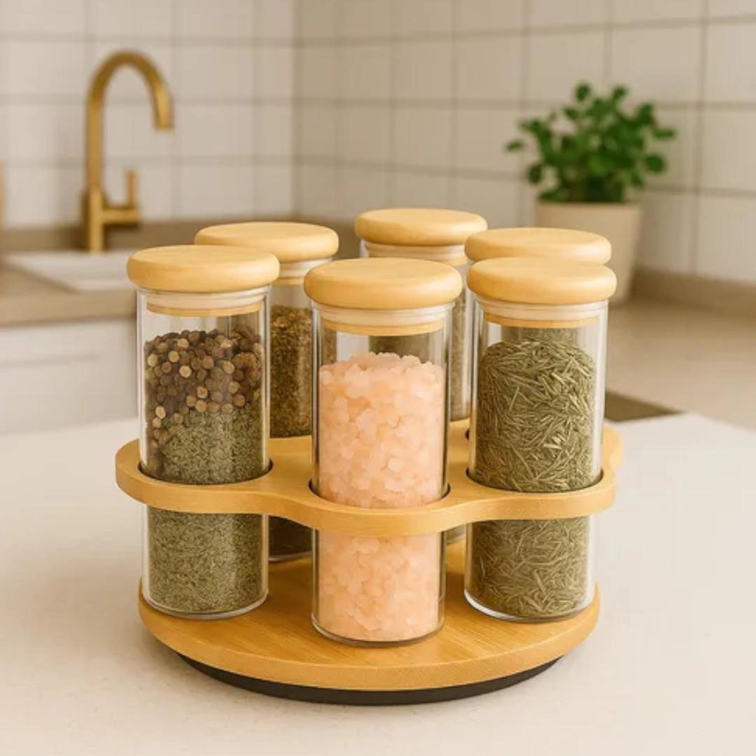 CONJ 6 PORTA CONDIMENTOS 31231 BOROSSILICATO 320ML C/ TAMPA E SUPORTE BAMBU FULLFIT