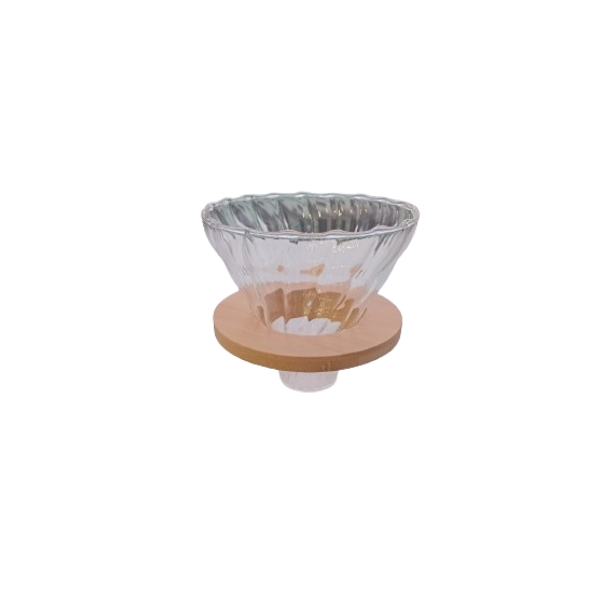1 Suporte de vidro com base de madeira para filtro de café número 2; altura 11,5cm e diâmetro de 10cm