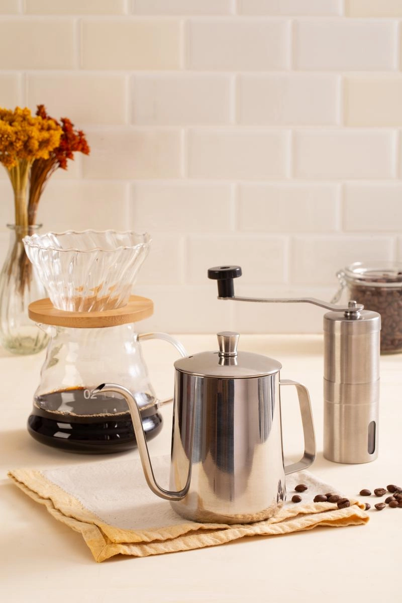 O kit é composto por um moedor manual de grãos de café em aço inox que vai trazer a experiência de um café fresquinho; um coador de vidro borossilicato número 2 com base madeira; uma chaleira 600ml produzida em aço inox com bico de ganso para adicionar água ao filtro com precisão e uma jarra com capacidade para 600ml produzida em vidro borossilicato que é extremamente resistente a altas temperaturas.