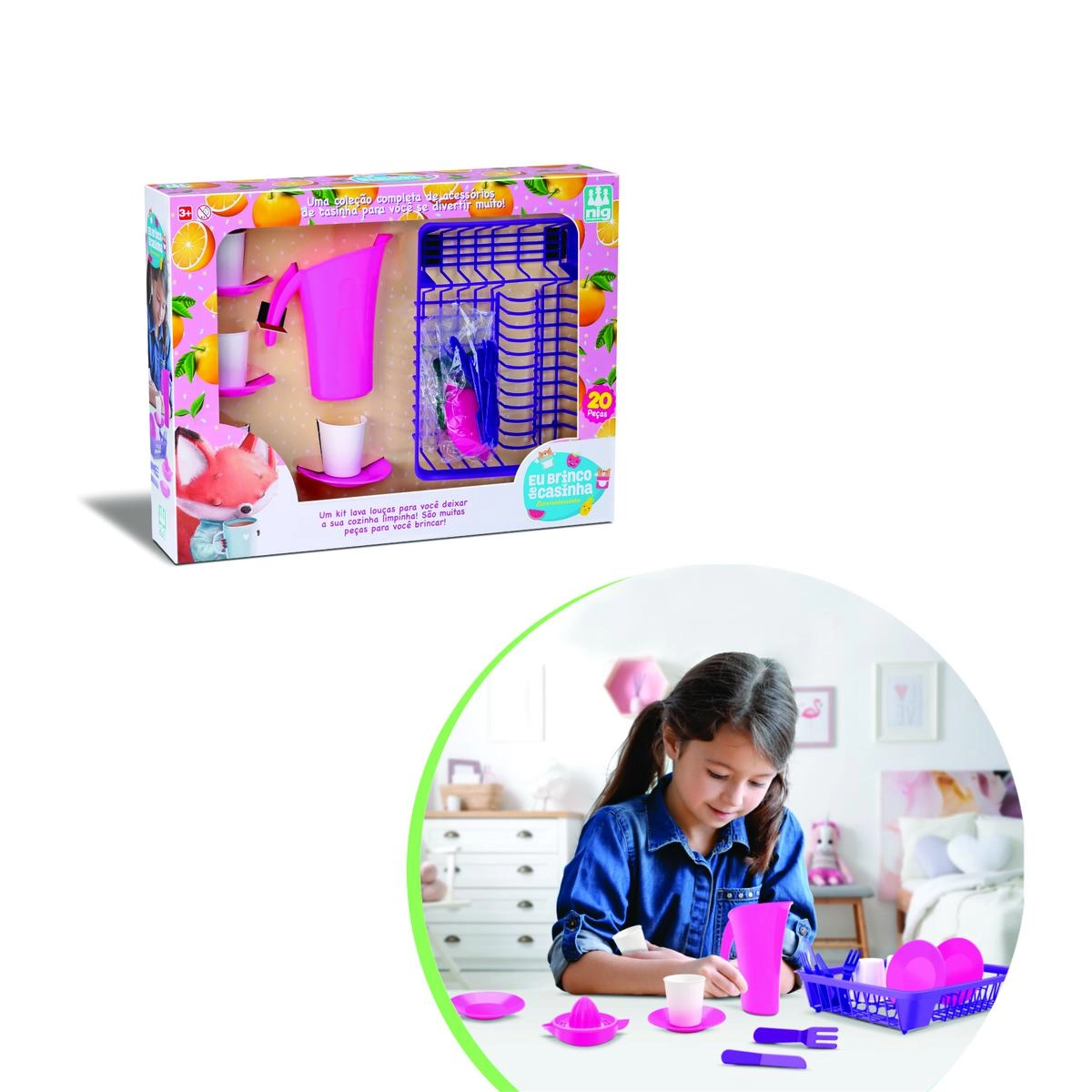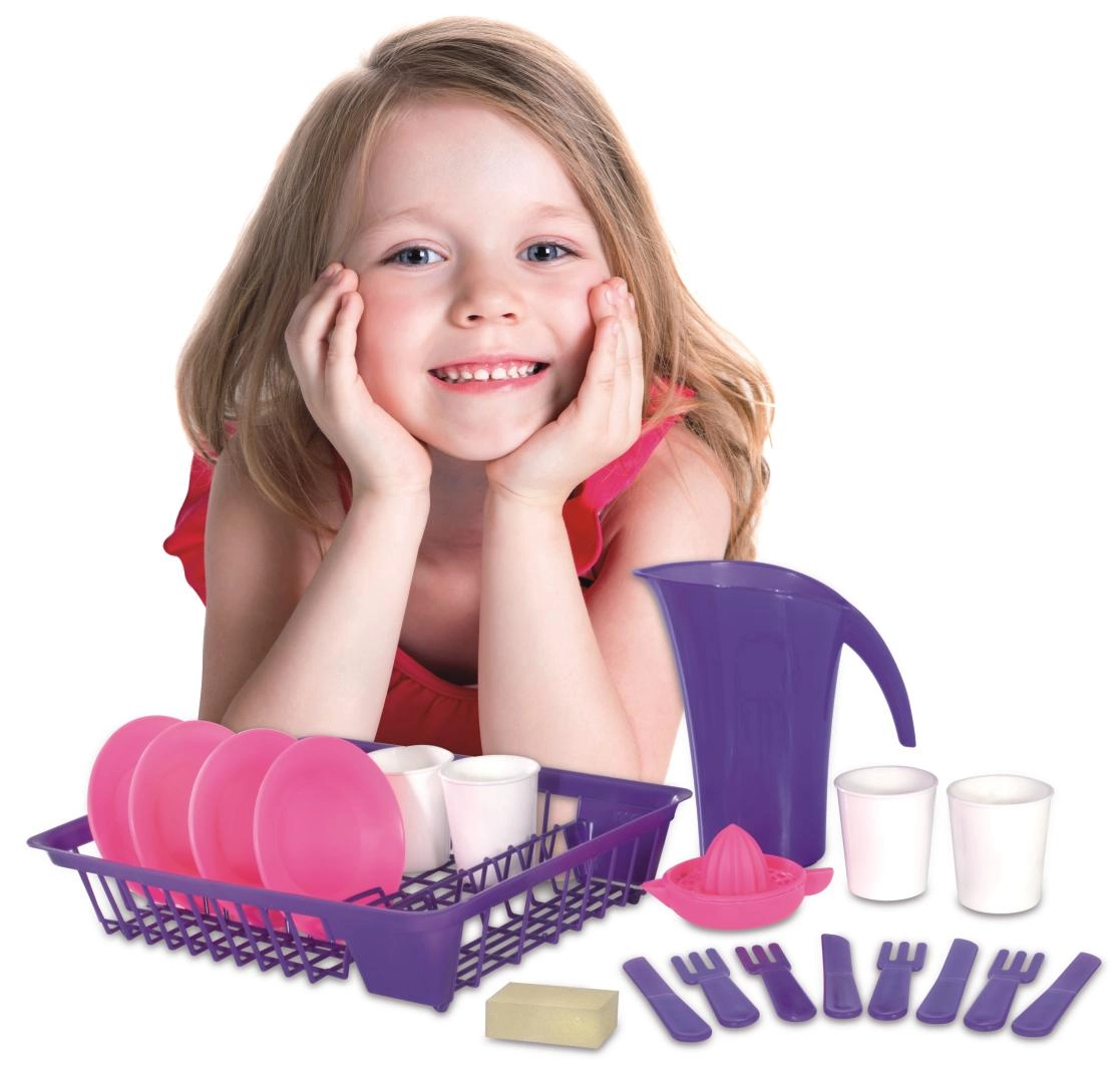 Nesta gostosa brincadeira, a criança vai poder lavar as loucinhas com água, bucha e detergente e colocar para secar no pequeno escorredor.