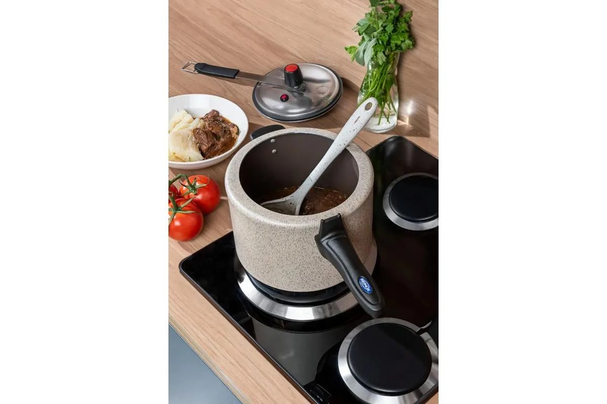 A Panela de Pressão com Revestimento Cerâmico 4,5 L da Linha Ceramic Life Vapt Brinox é fabricada com estrutura em alumínio. Tal característica garante uma distribuição homogênea de calor. O antiaderente com tecnologia Mineral Resist garante facilidade na limpeza e permite a cocção mais saudável dos alimentos, pois requer menos óleo. Além disso, não libera toxinas nos alimentos. Os cabos são em baquelite e o produto ainda conta com três dispositivos de segurança.