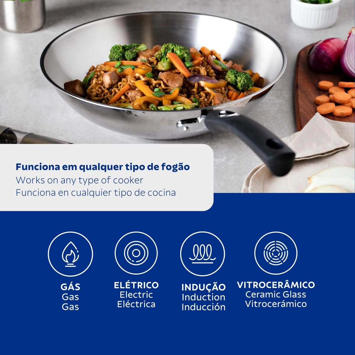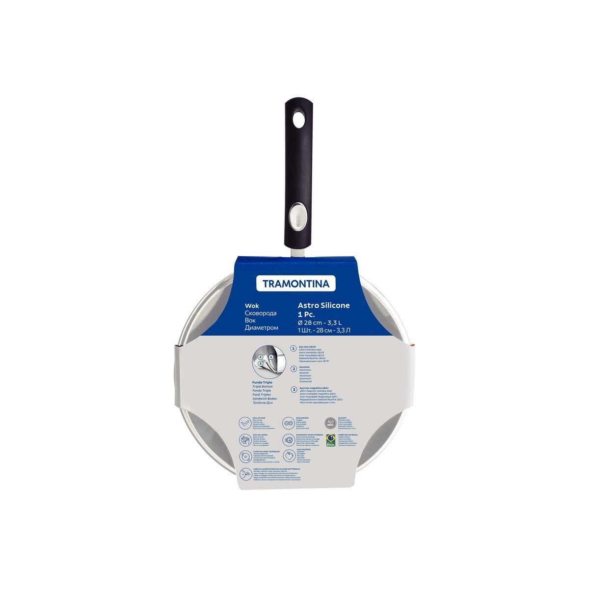 Para preparar suas receitas com muito mais qualidade e estilo, conte com a wok Tramontina Astro Silicone em aço inox com fundo triplo e tampa de vidro 28 centímetros de diâmetro.