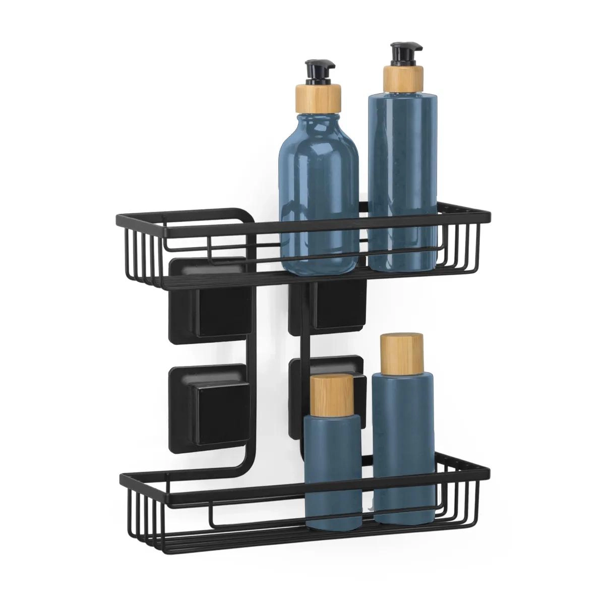 Sua fixação por ventosas quadradas de alta resistência dispensa o uso de ferramentas, furos ou parafusos, permitindo uma instalação rápida e segura em superfícies lisas como vidro, cerâmica ou azulejos. As duas prateleiras espaçosas comportam frascos de diferentes tamanhos, otimizando o espaço no box.