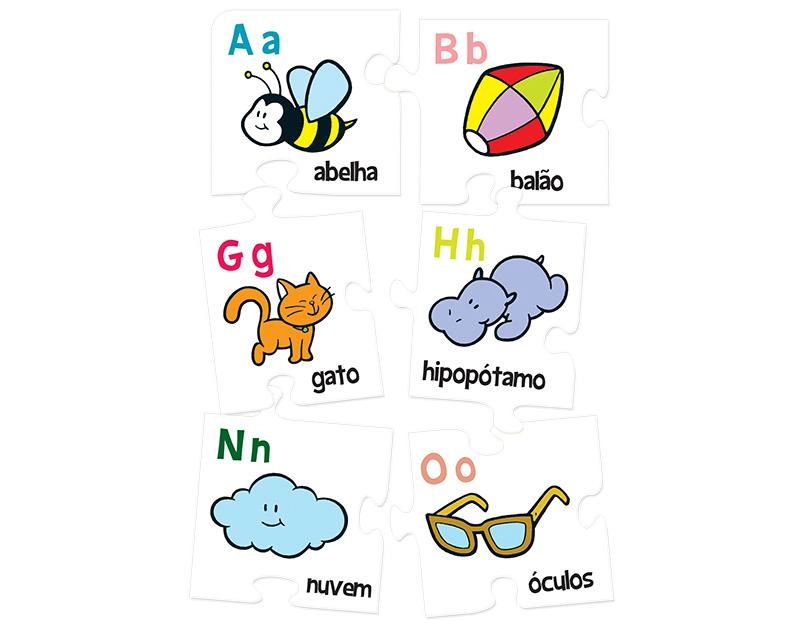 O quebra-cabeça é composto por 26 peças com as letras do alfabeto e figuras que representam cada letra.