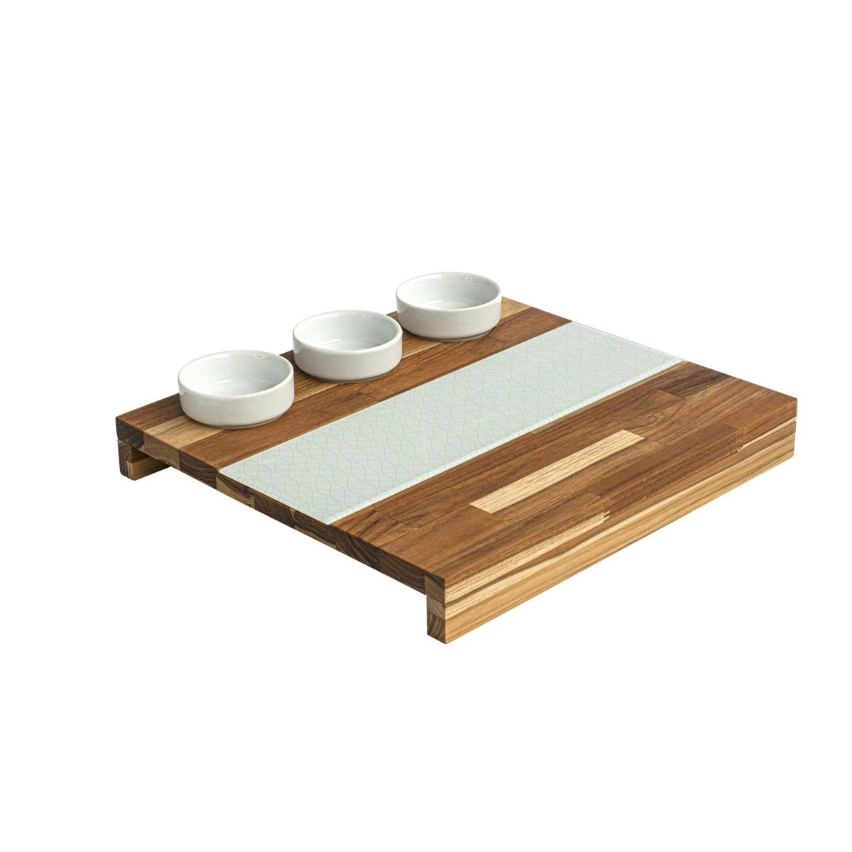 A tábua é produzida em madeira e conta com um vidro central decorado em branco, o que confere maior beleza a peça. Além disso, a tábua acompanha três potes em porcelana, ideal para servir acompanhamentos como por exemplo, molhos.