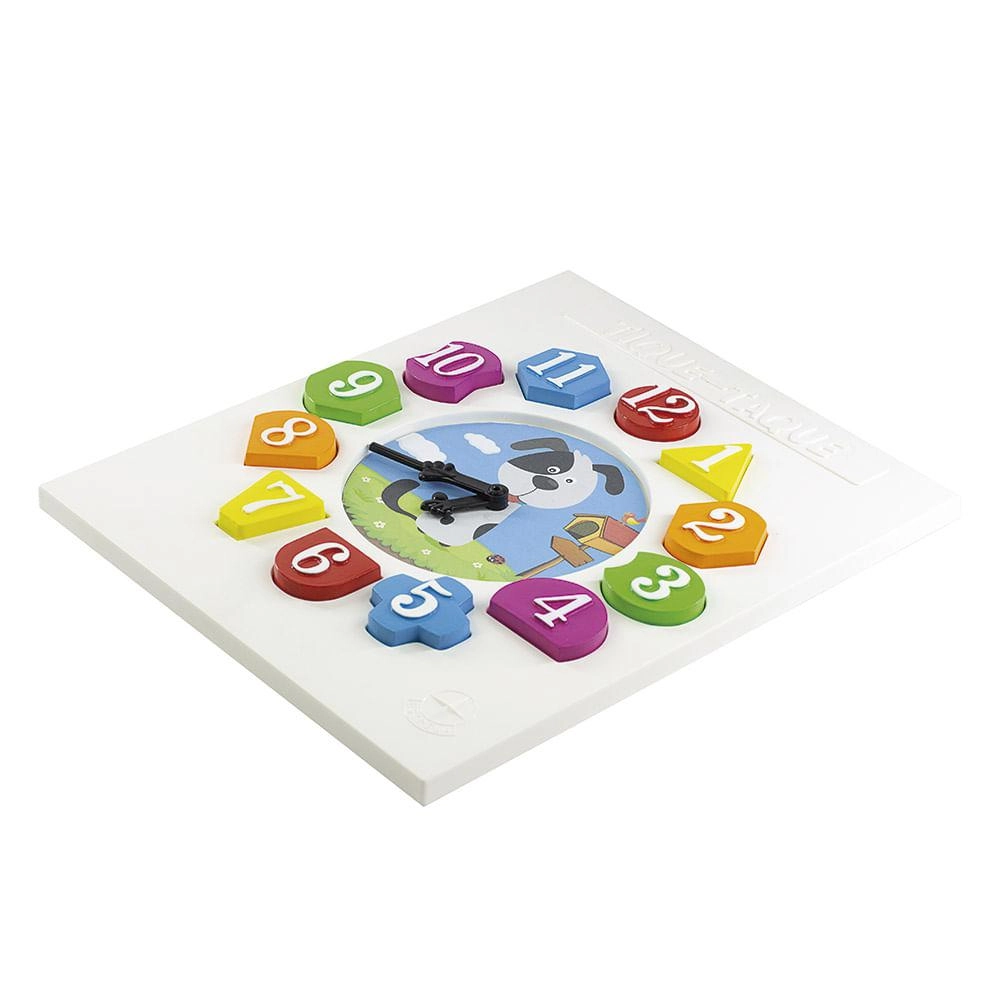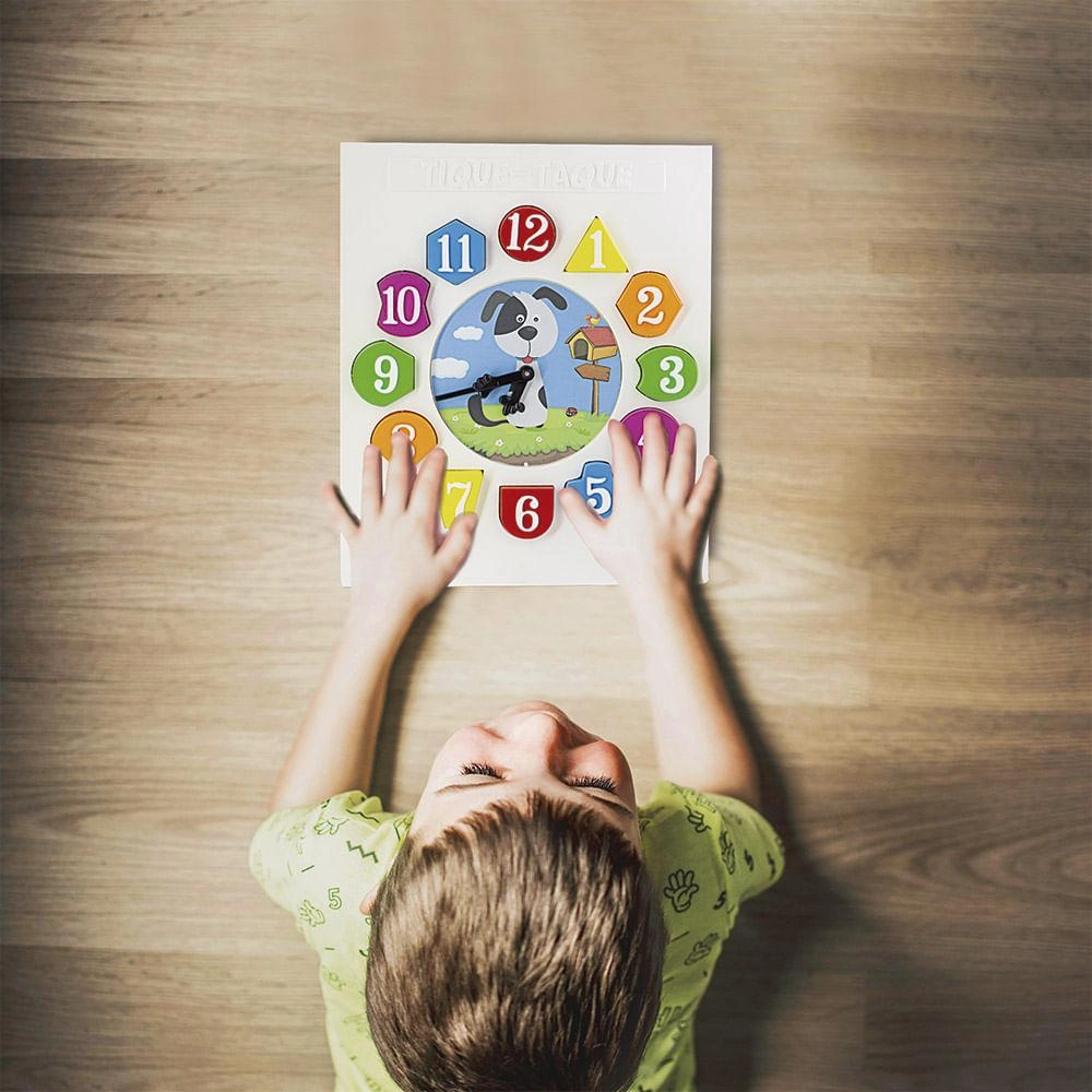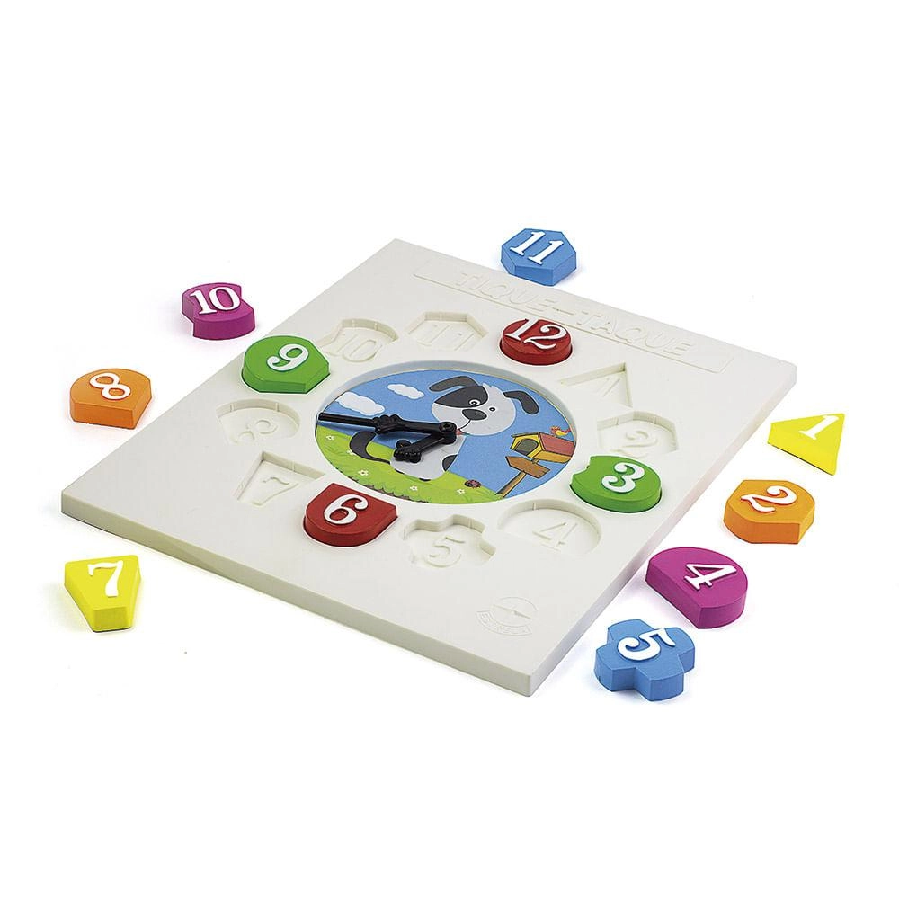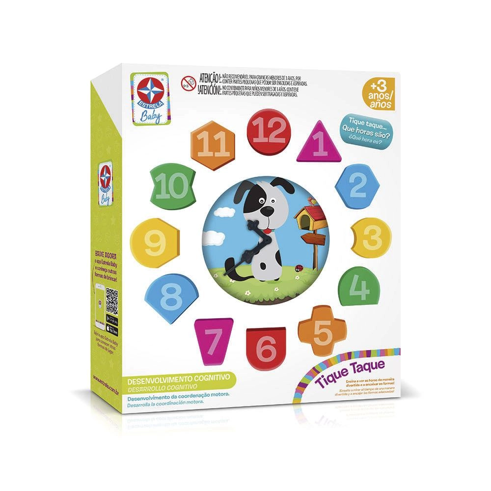 Tique Taque ensina a criança na fase de aprendizado das horas. Além disso, estimula a coordenação motora já que a criança tem que encaixar as formas geométricas na ordem correta.