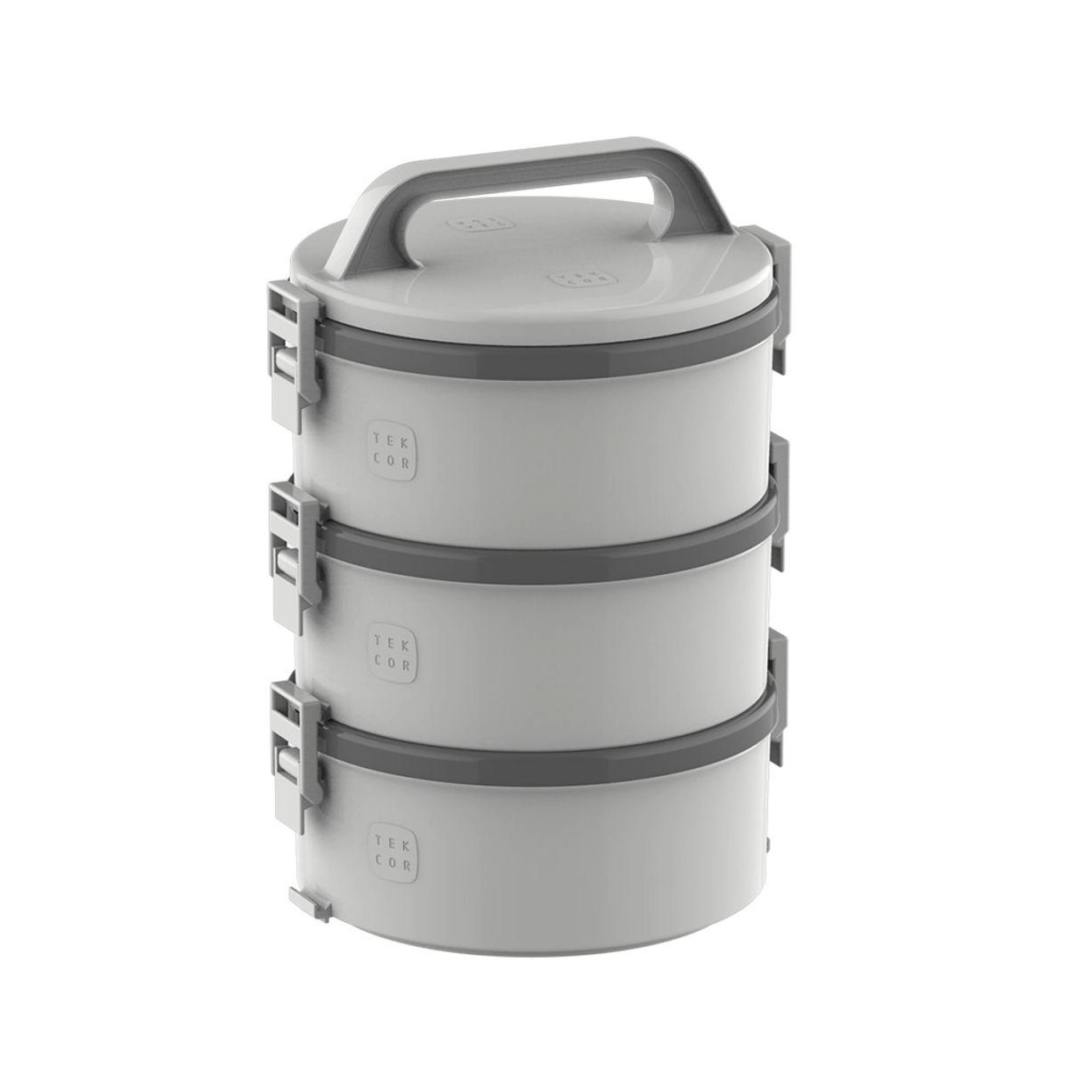 Conserva os alimentos em temperatura ideal para consumo. Possui presilhas para fechamento e alça robusta para transporte. Pode ser utilizado no microondas (sem a tampa). Conta com três pratos- um sem divisão interna, um com divisão interna dupla e um com divisão interna tripla.